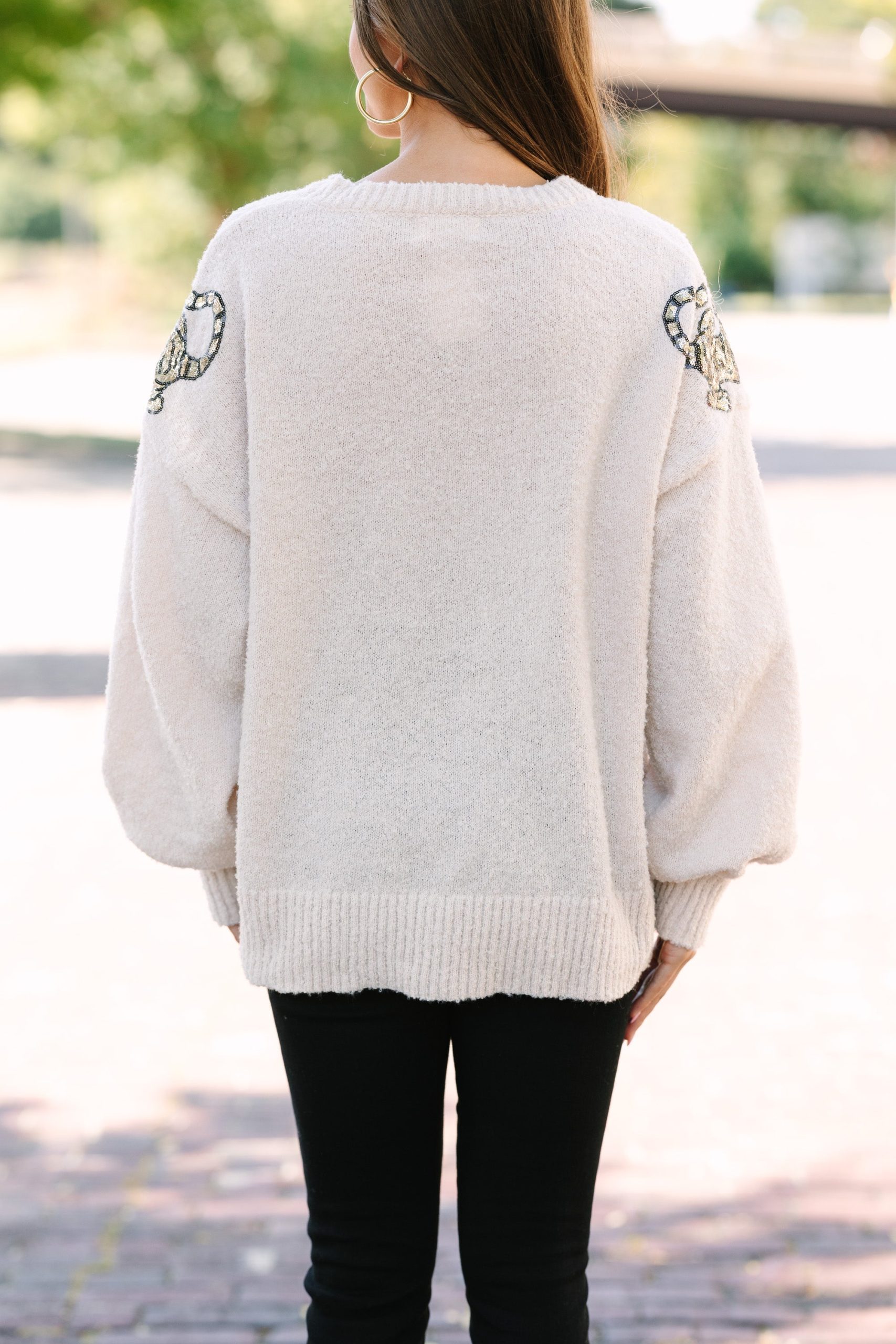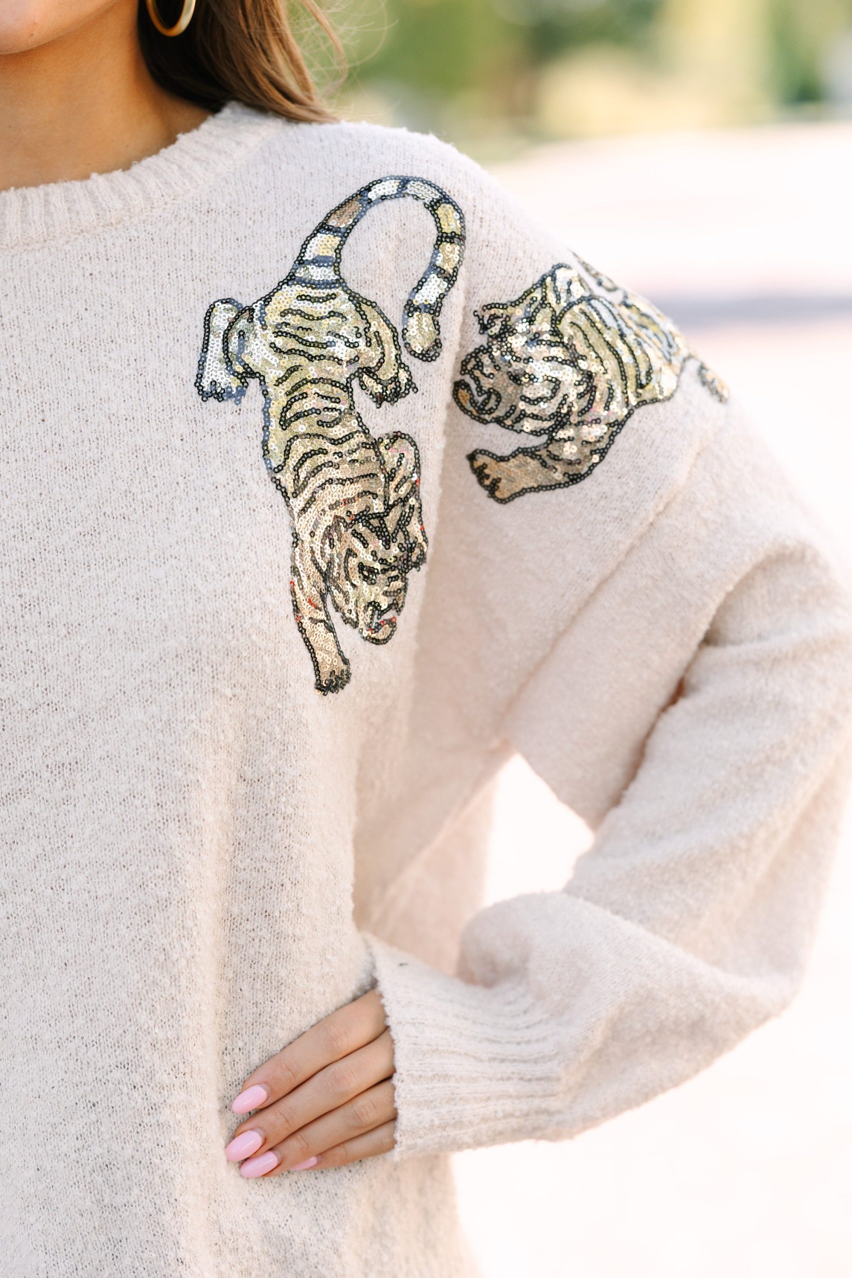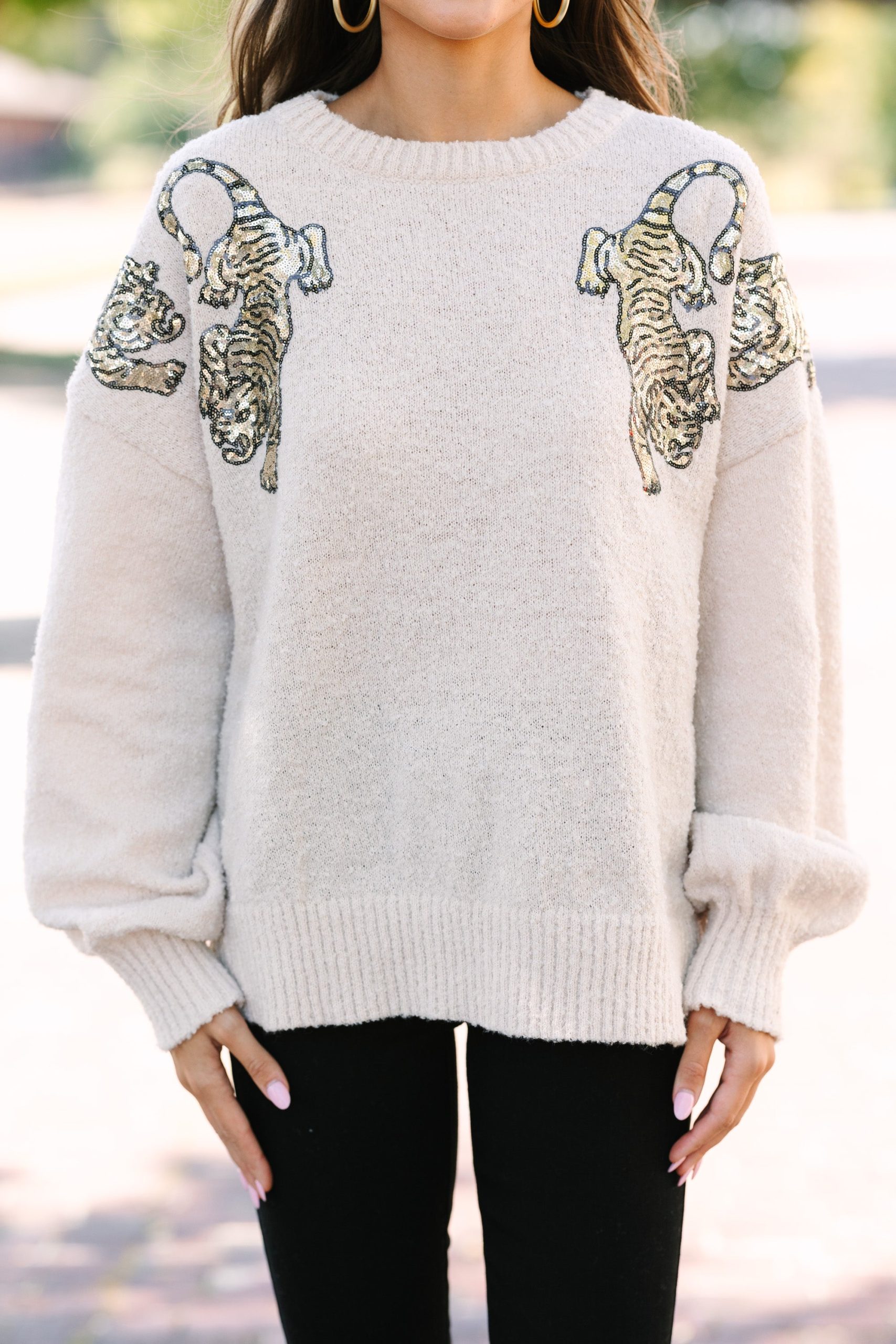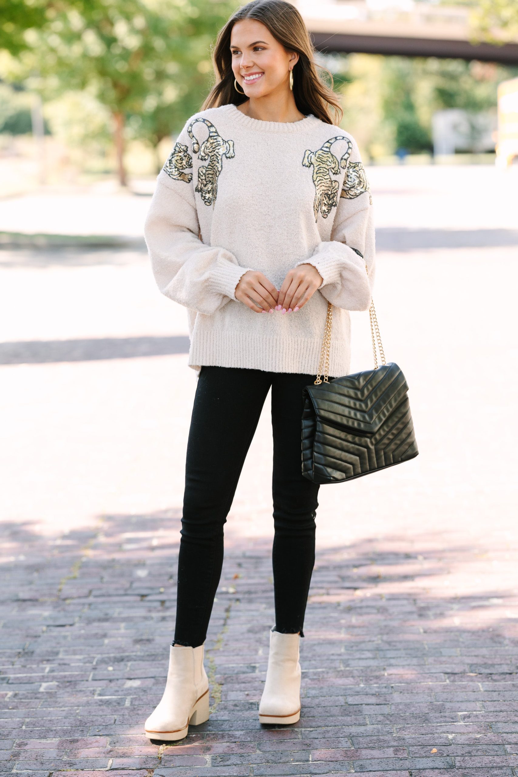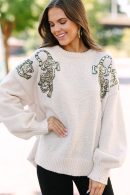 There is so much to love about this fun sweater! Those sequined tigers over the shoulders are so sassy add the perfect amount of pop this neutral beauty! This sweater is going to look great with dark to light wash jeans!